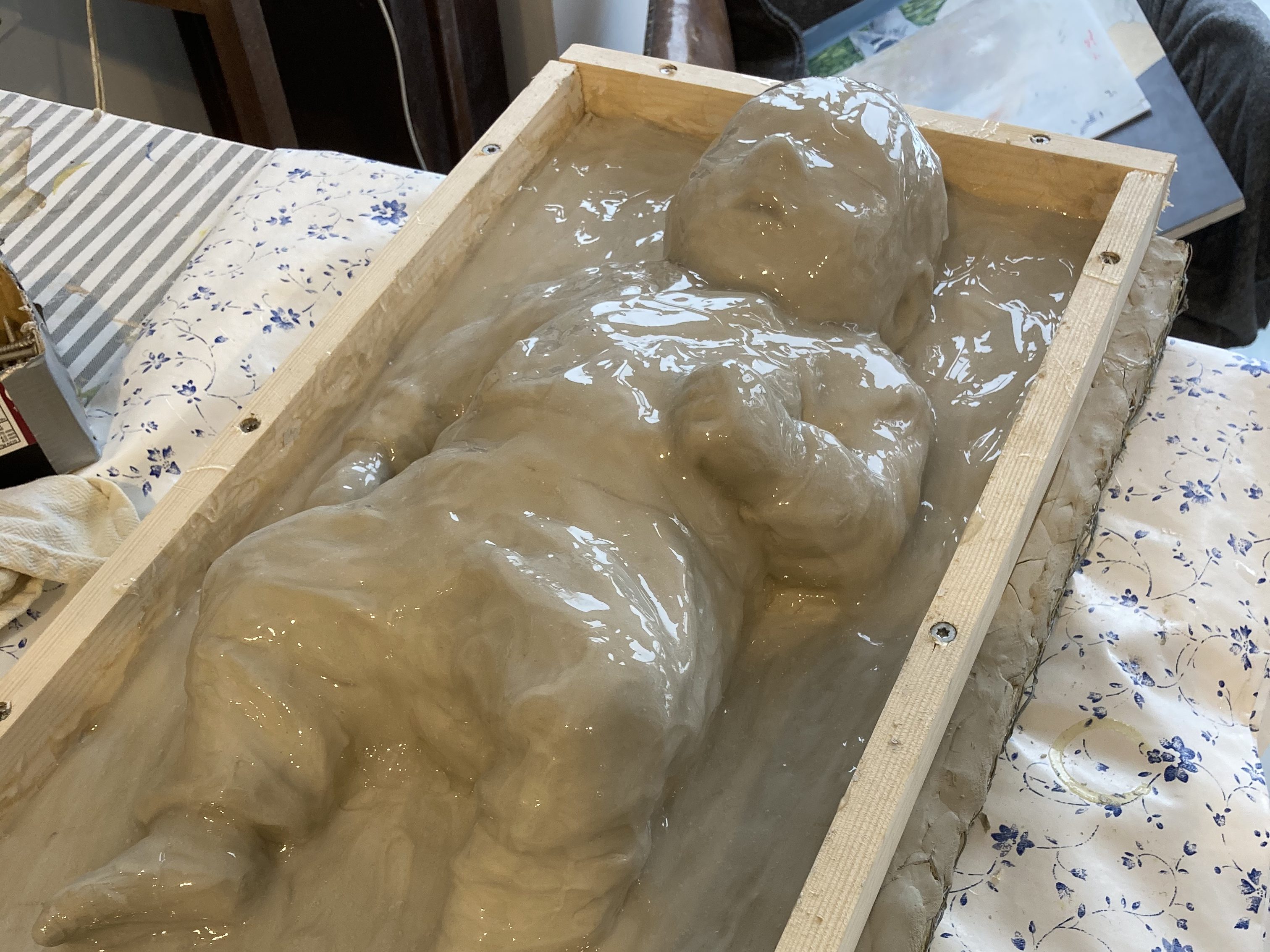 A silicone mold is made over the clay figure.
