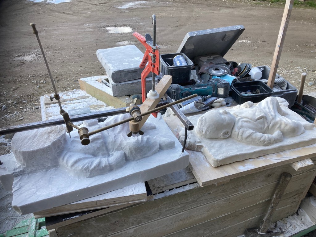 Using a pointing machine (invented in the 18th century) which can be moved between the model and the marble block, thousands of points are transferred from the model to the stone. The pointing machine can be used for all three dimensions and is attached in 3 fixed points in both plaster model and marble block.